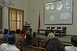 Interrogantes planteadas por el profesor Minniti y que respondió, a la primera y a la segunda, especificando que vida como la entendemos nosotros, no, pero que en alguno quizás podría haberla, de hecho informó que se ha calculado que fuera del sistema solar hay más de 300 posibles “tierras”, incluso tres “súper tierras” –similares a la nuestra, pero más grandes-, y que se confirmaría la existencia de la primera dentro de los próximos cinco años. Esto, luego de explicar las metodologías con las que calculan densidad y movimientos de los exoplanetas y de hacer, previamente, una interesante exposición acerca de las características de los planetas que nos rodean, sus anillos y lunas.