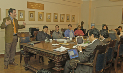 Roxana Pey, directora Ejecutiva del Fondo de Innovación Académica de Mecesup, explicando el propósito de la visita. A su mano izquierda Fernando Frick y Marcelo López. |
