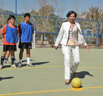 La doctora Cecilia Sepúlveda, decana de la Facultad de Medicina, da el puntapié inicial al partido que inauguró la multicancha. |