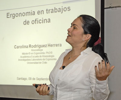 “En materia de ergonomía Chile está atrasado al menos 10 años con respecto a los países desarrollados”, comentó la académica de la Escuela de Kinesiología de la Facultad de Medicina de la U. de Chile, Carolina Rodríguez, quien ofreció el jueves 9 de septiembre una conferencia sobre ergonomía y los puestos de trabajo.