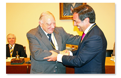 El doctor Rodolfo Armas Merino, presidente de la Academia Chilena de Medicina felicita al doctor Miguel O’Ryan.